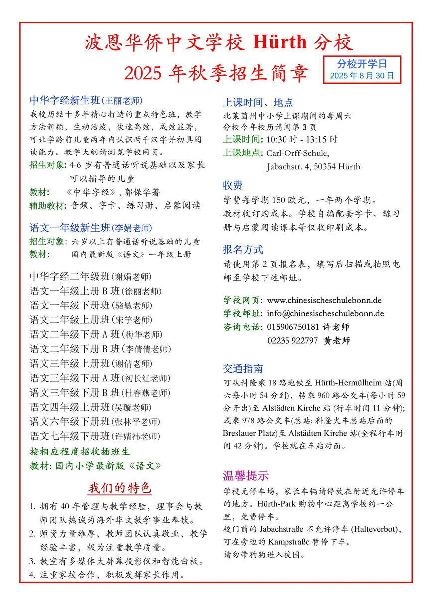 波恩华侨中文学校拥有三十余年的悠久历史。全校各班均采用多媒体教学, 以生动活泼的教学方式提高学生学习汉语与中华文化 的兴趣和效果。我校的中文教学自2008年以来采用双轨制,根据学生本身中文基础及家庭语言环境,采用两套不同的教学方法和教材。请新生家长仔细阅读以下简介,选择适合的教学班报名。